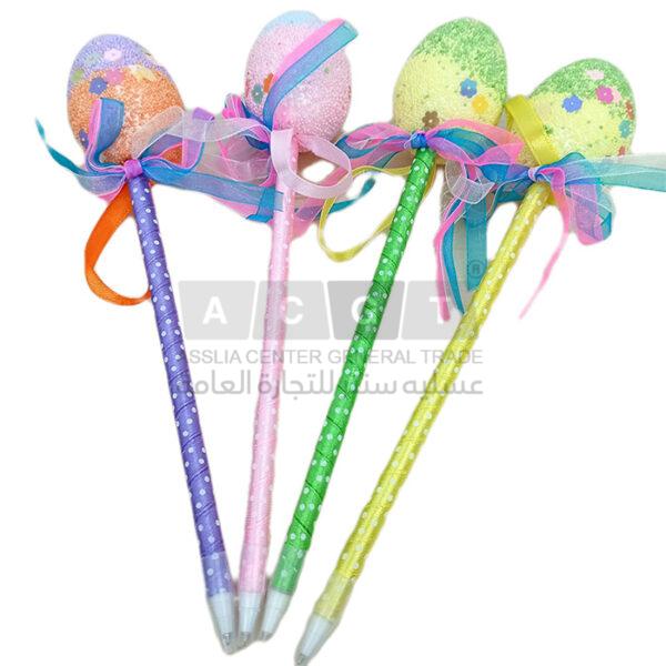 قلم حبر أزرق اللون مع مجسم على شكل بيضة