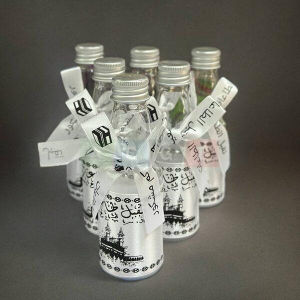 قناني ماء زمزم فضية اللون مع زينة صغيرة الحجم