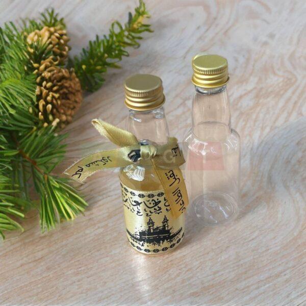 قناني ماء زمزم ذهبية اللون مع زينة صغيرة الحجم
