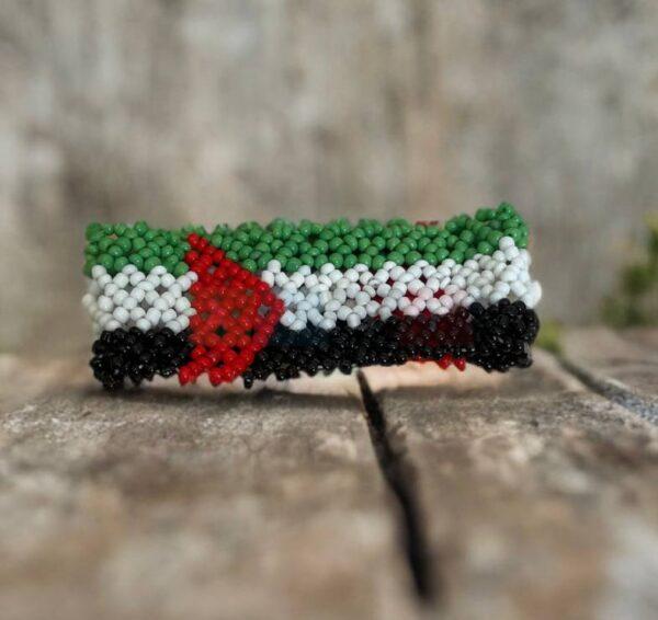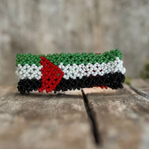 • مصممة من خرز ملون بألوان علم فلسطين: الأحمر، الأخضر، الأبيض، والأسود