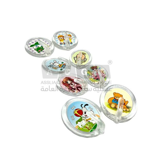 علاقات بلاستيك بيضاوية الشكل شفافة برسومات مختلفة مع طبع من الخلف لتلزيق