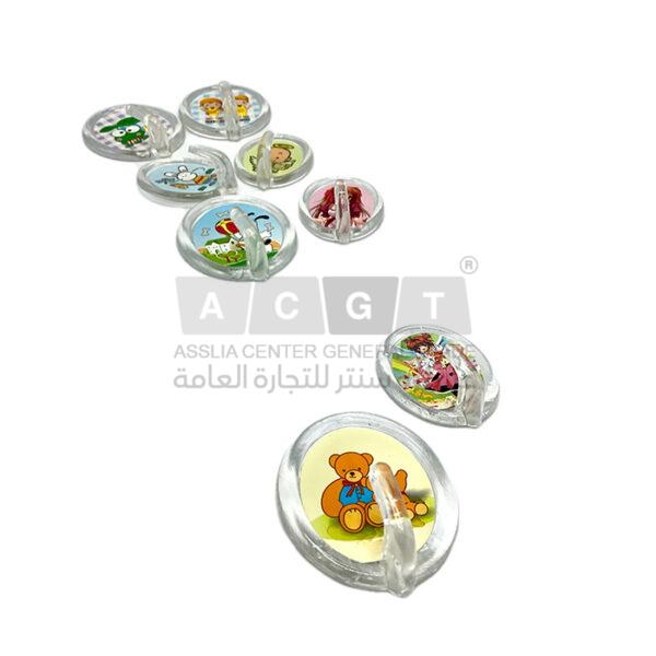 • علاقات بلاستيك بيضاوية الشكل شفافة برسومات مختلفة مع طبع من الخلف لتلزيق