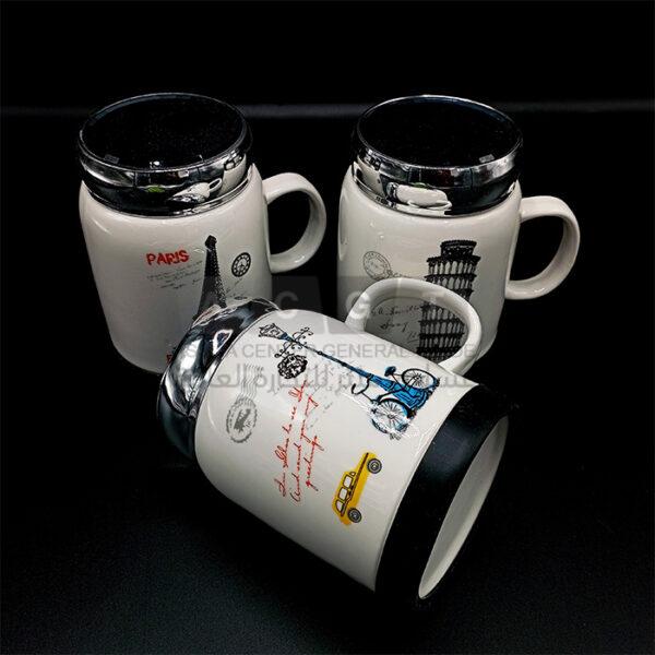 مج سيراميك أبيض مرسم عليه برج إيفيل وبيزا، وعامود كهرباء مع سيارة