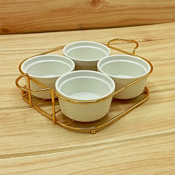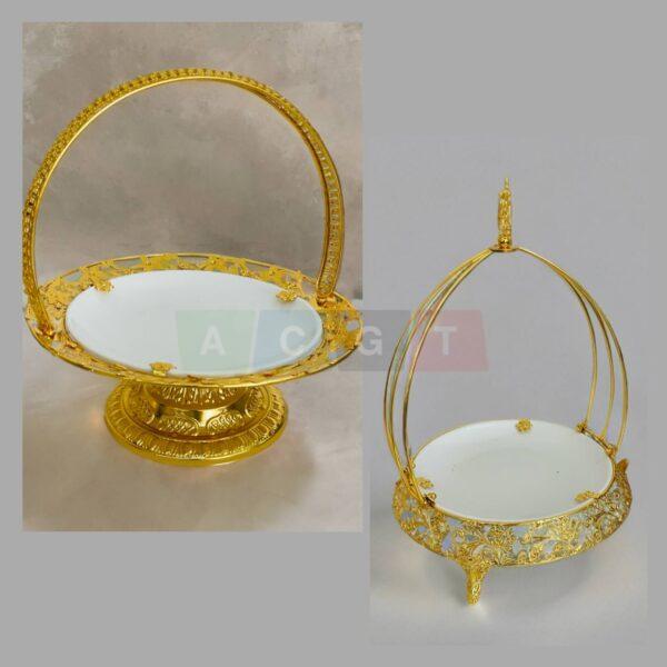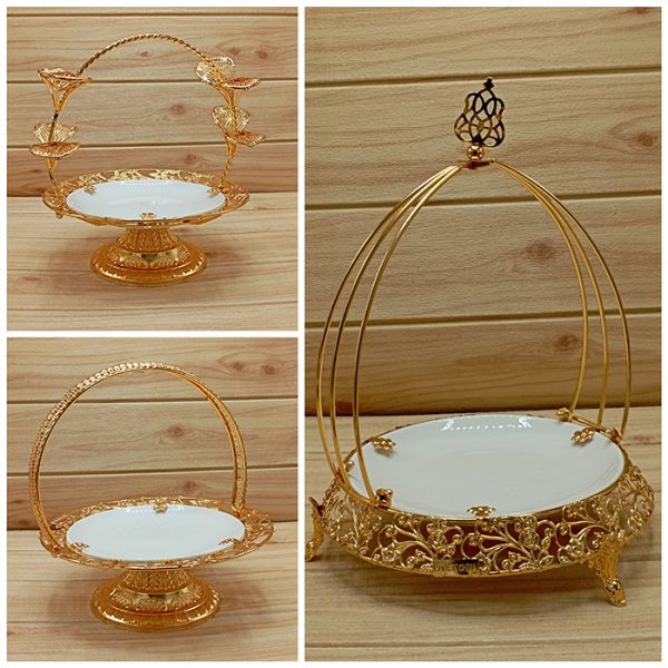 مضيفة حلويات ذهبية اللون مع صحن بورسلان أبيض اللون