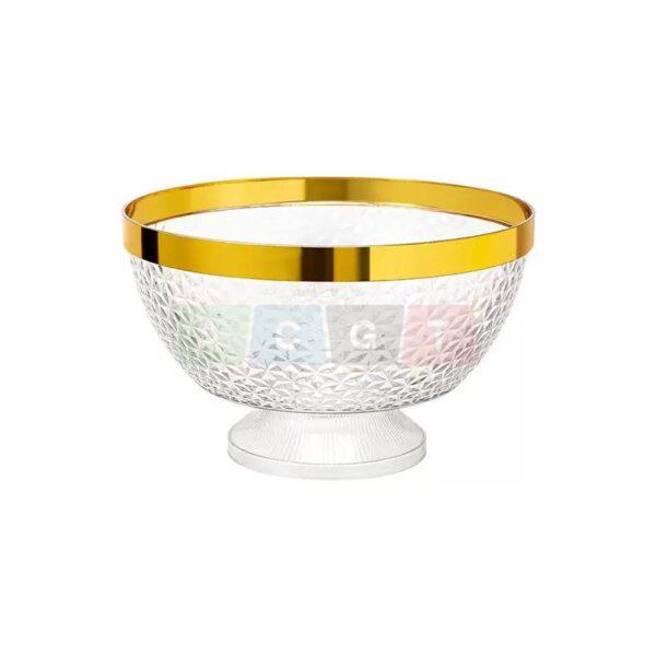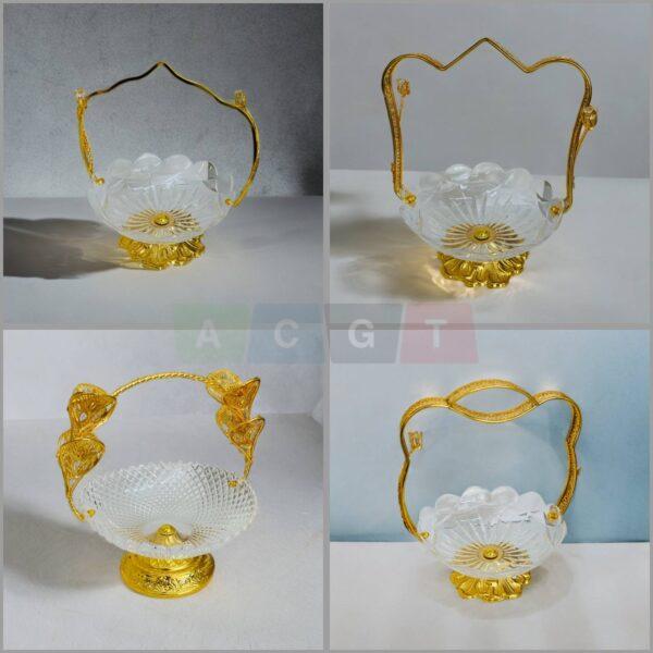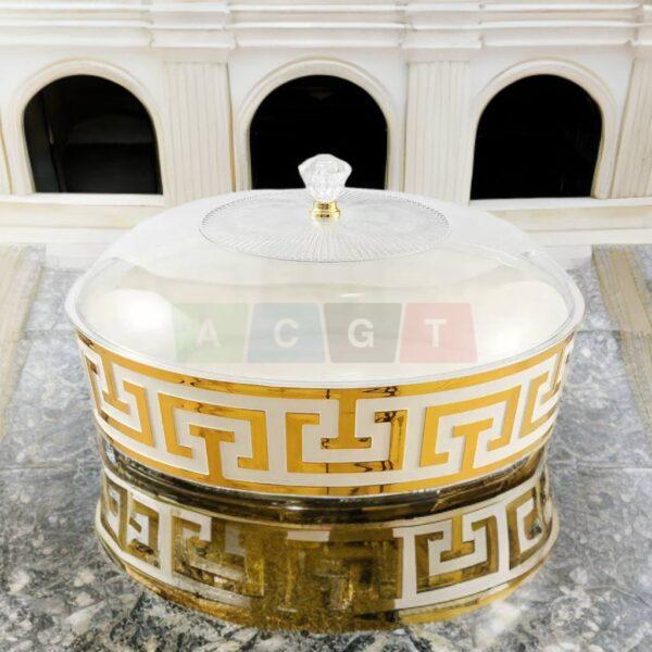 مضيفة حلويات ذهبية اللون مع صحن أكريليك شفاف